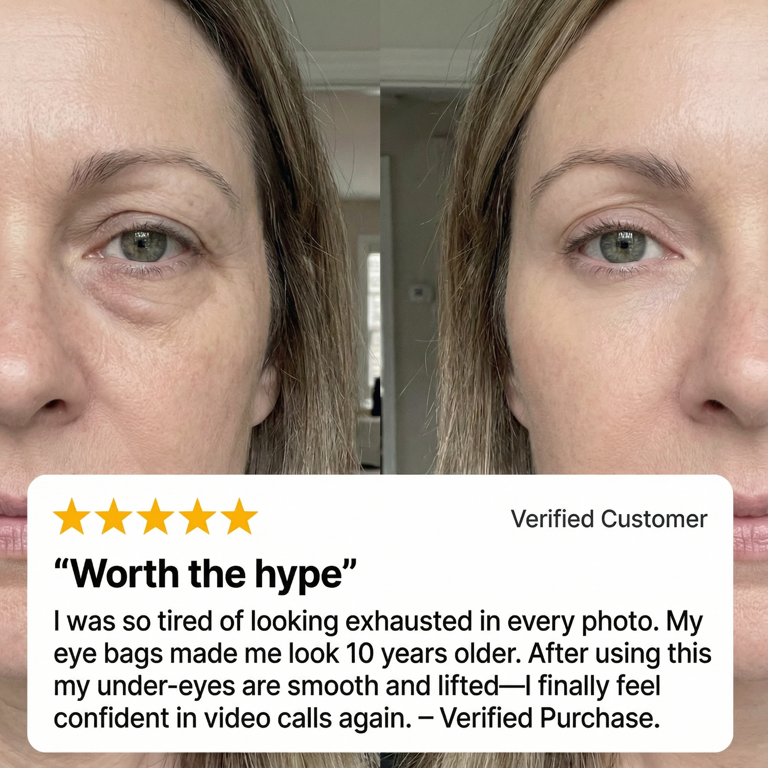 This formula uses a film-forming tightening matrix plus targeted peptides to physically lift the area in minutes and support the skin underneath over time. The reason this feels so different is simple: it’s solving the real mechanical issue instead of pretending hydration alone can erase bags and wrinkles.